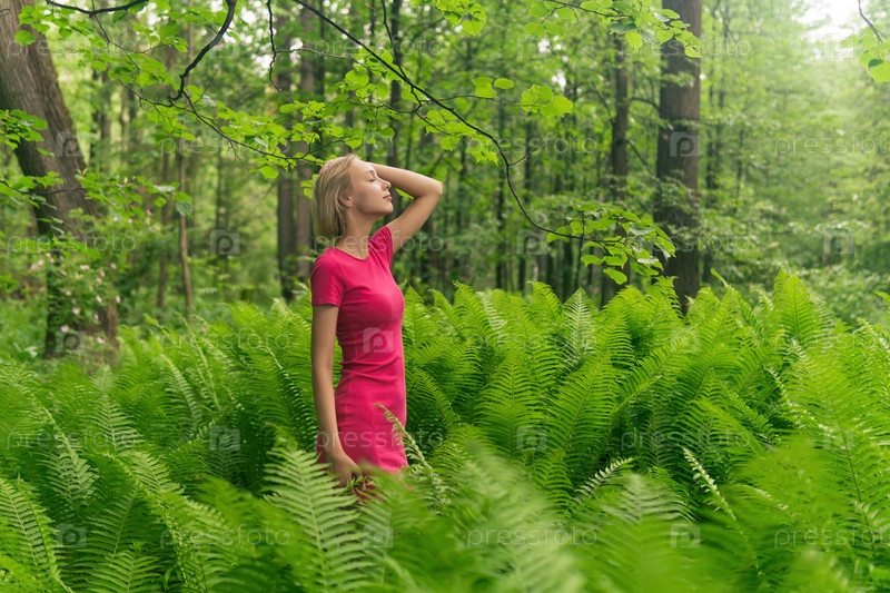 Красивая девушка в весеннем лесу среди папоротников