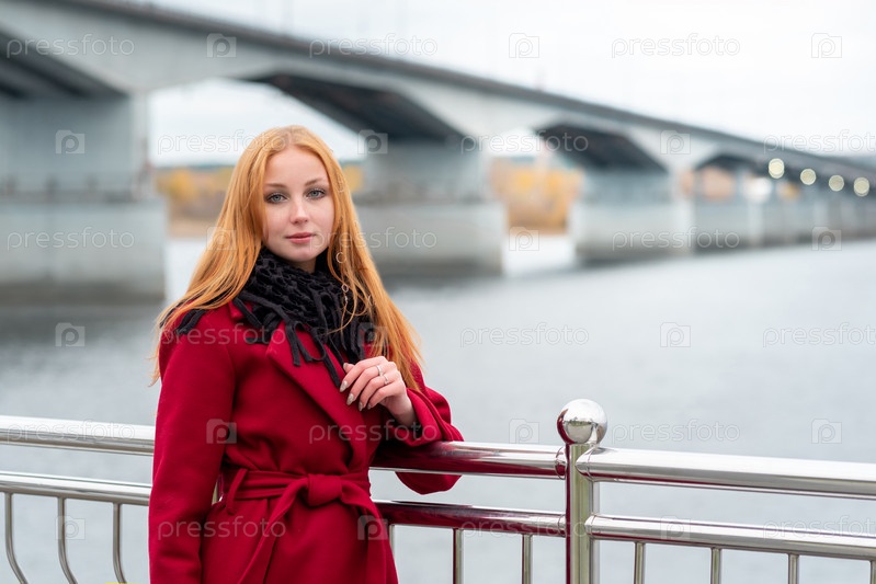 Молодая женщина гуляет по набережной в прохладный осенний день