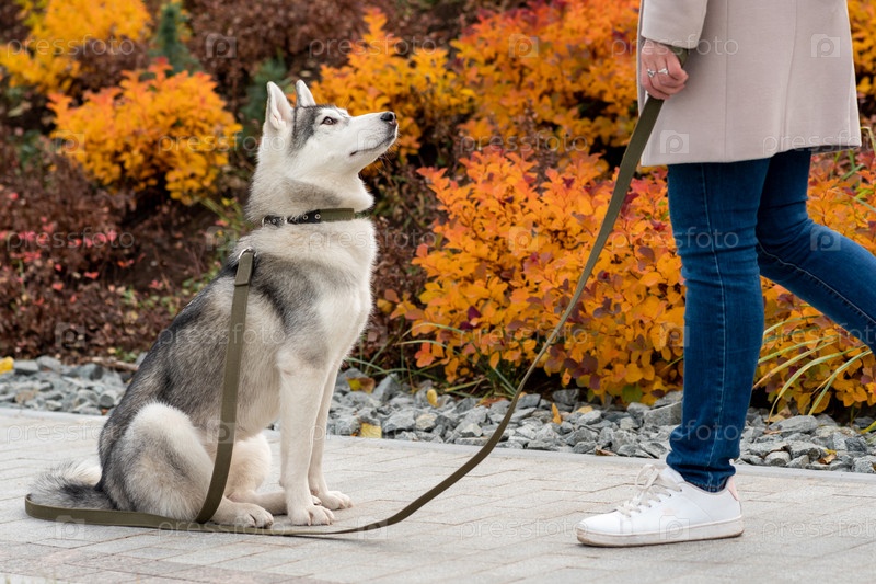 Собака хаски рядом со своим хозяином на фоне осенней листвы