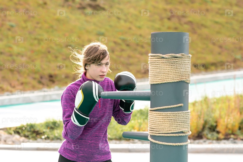 Молодая женщина занимается единоборствами на спортивной площадке с традиционными манекенами