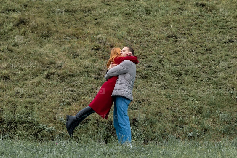 Встреча влюбленных, мужчина и женщина обнимаются на открытом воздухе