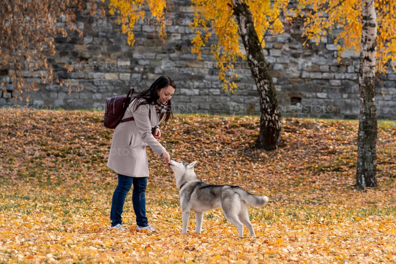 Молодая женщина дрессирует свою собаку хаски в городском парке