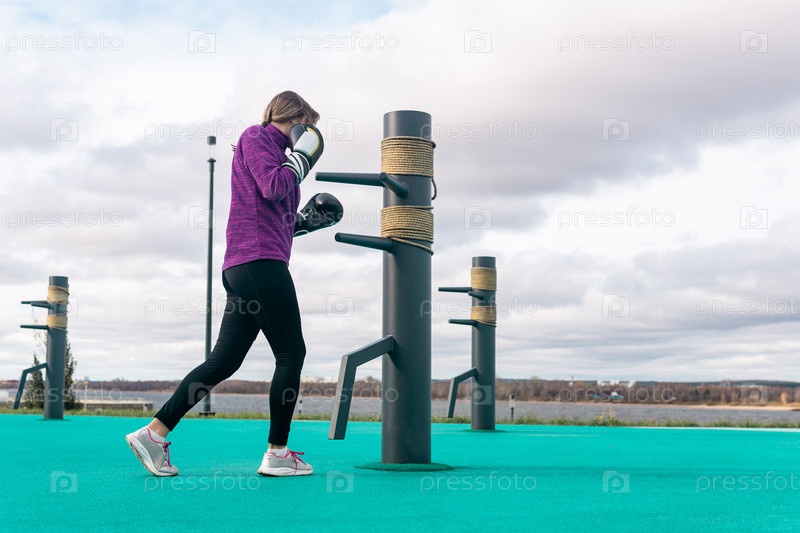 Молодая женщина занимается боевыми искусствами в одиночку на спортивной площадке с традиционными манекенами