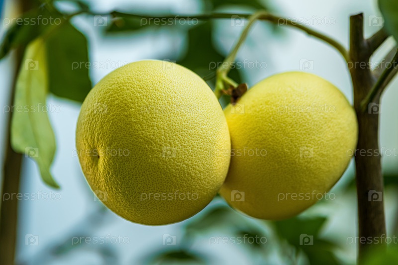 Созревающие плоды помело на ветке в саду крупным планом