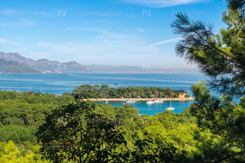 Гавань с парусными кораблями на побережье Средиземного моря недалеко от Кемера, Турция, вид с горы