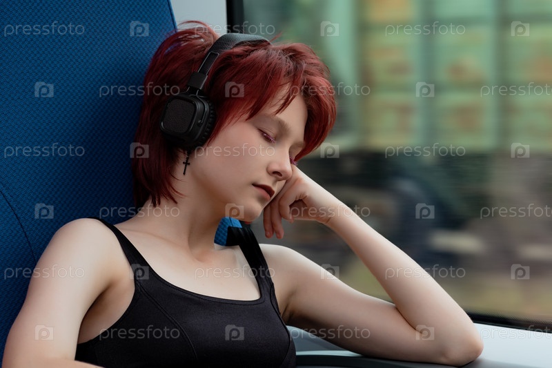 Молодая женщина задремала в вагоне движущегося пригородного поезда, слушая музыку