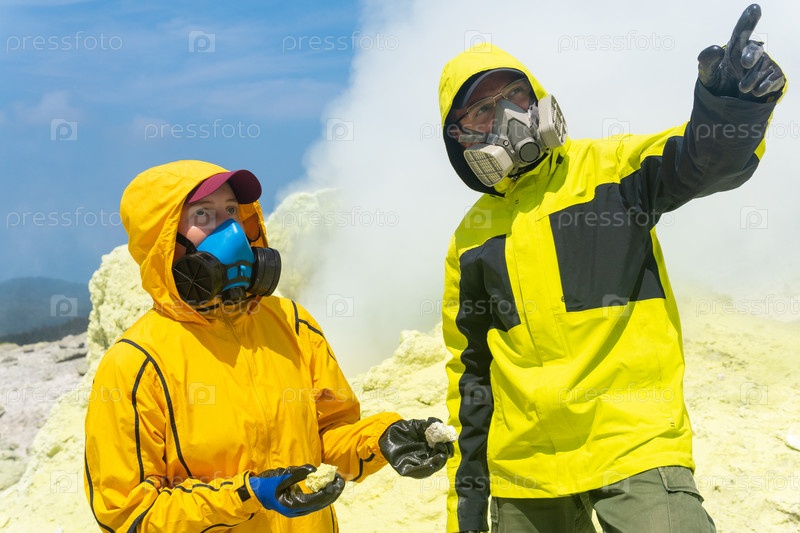Ученые-вулканологи на склоне вулкана собирают образцы минералов на фоне дымящихся серных фумарол