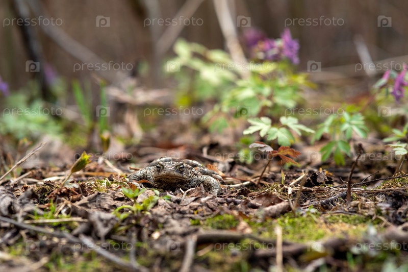 Обыкновенная жаба прячется среди сухой листвы и весенней растительности