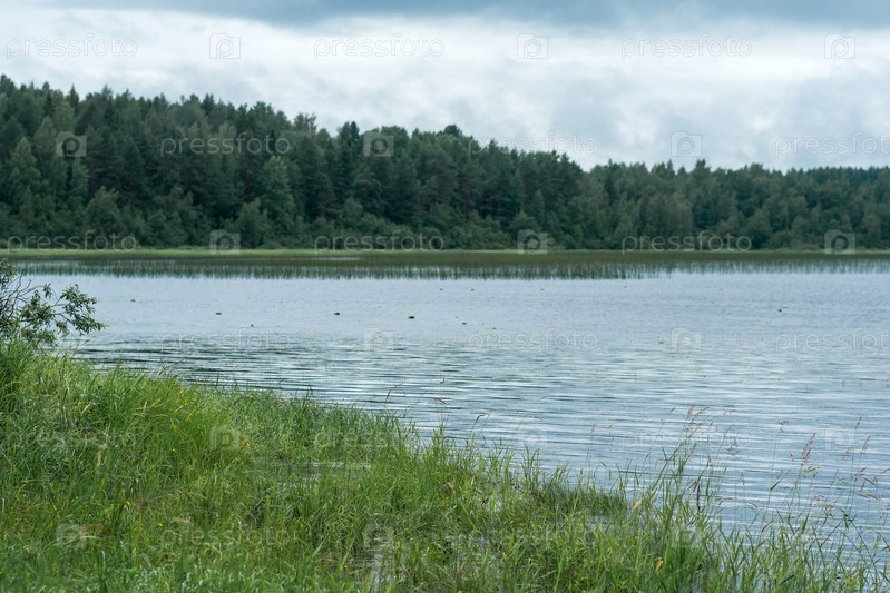 Природный ландшафт, травянистый берег озера с тростниковыми берегами в пасмурный день