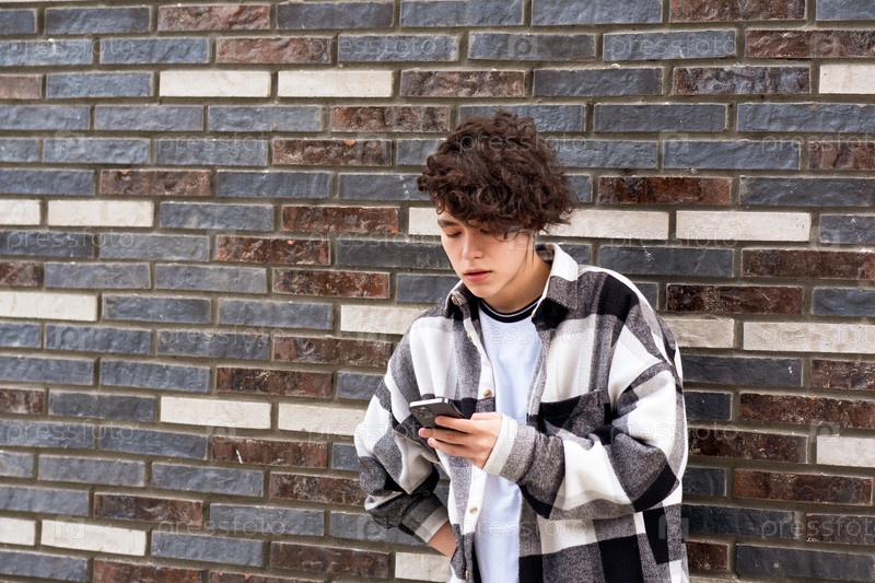 Молодой человек читает сообщение по телефону у кирпичной стены