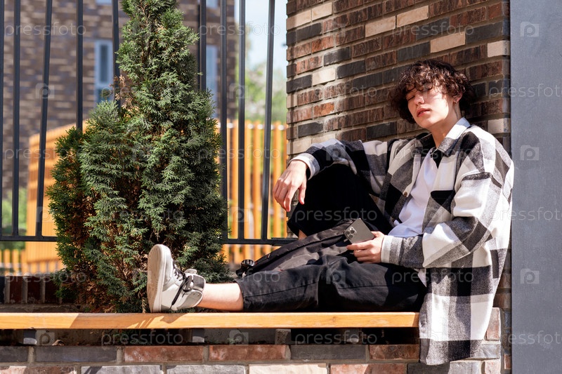 Молодой человек расслабленно сидит на городской скамейке