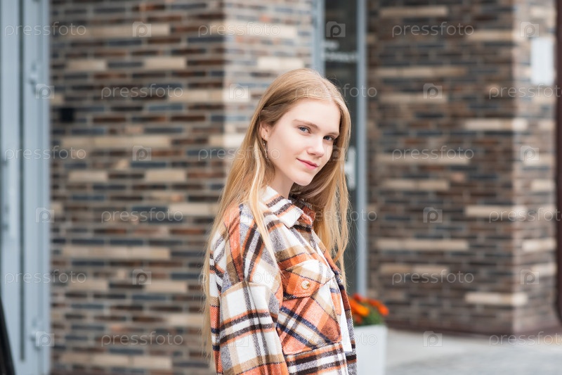 Молодая женщина входит в дверь городского здания на размытом городском фоне