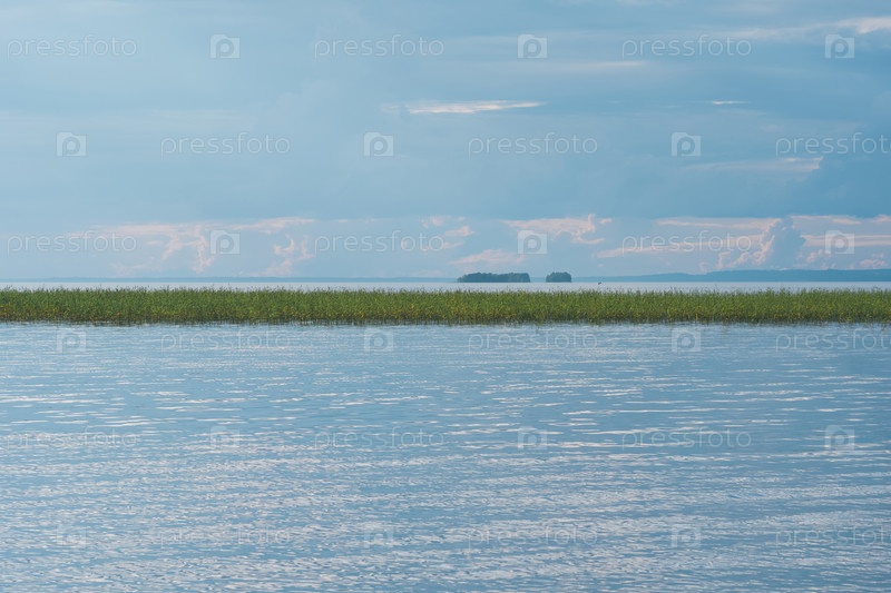 Естественный водный ландшафт, огромное мелкое озеро с тростниковыми берегами в дождливый день