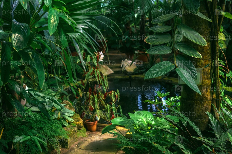 Интерьер древней оранжереи с тенистым бассейном среди тропической растительности