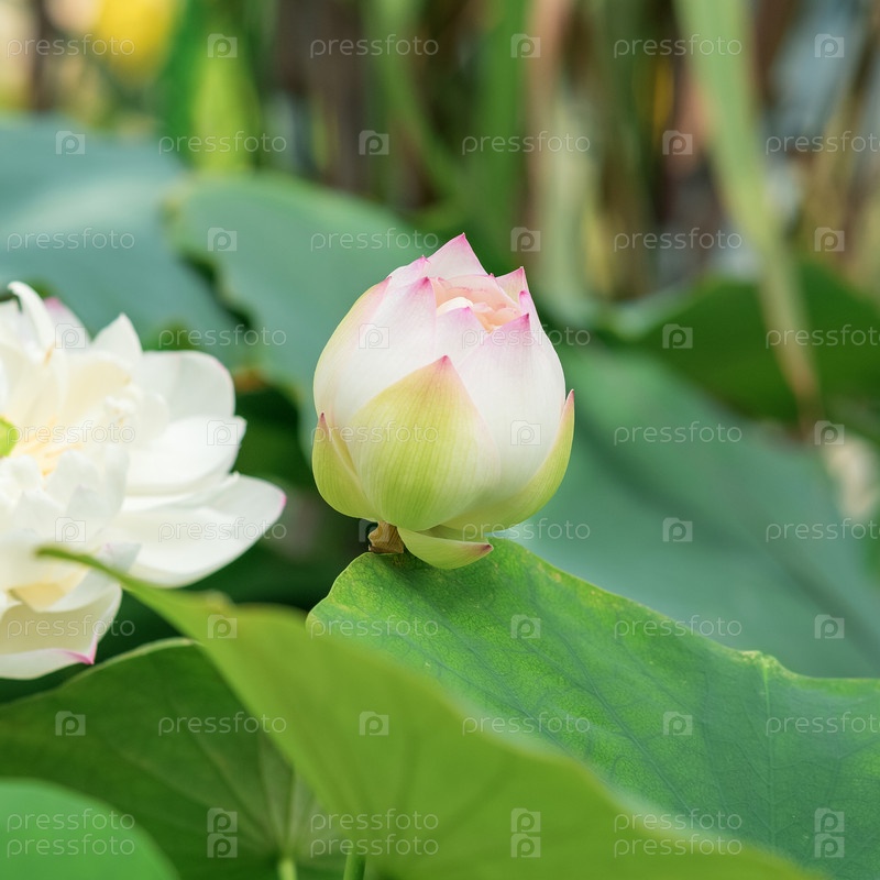 Бледно-розовый бутон лотоса в пруду при солнечном свете