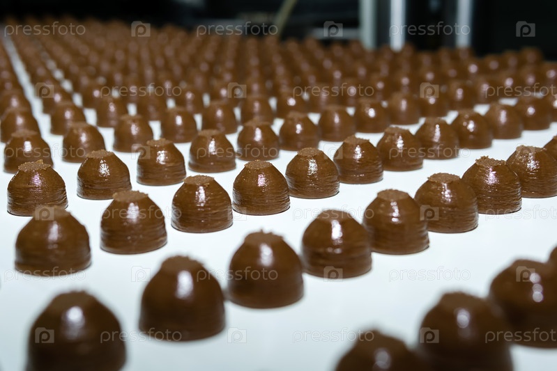 Шоколадные начинки на конвейере кондитерской фабрики крупным планом