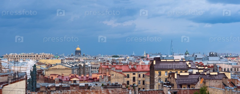 Панорамный вид на крыши города в историческом центре Санкт-Петербурга в дождливый день
