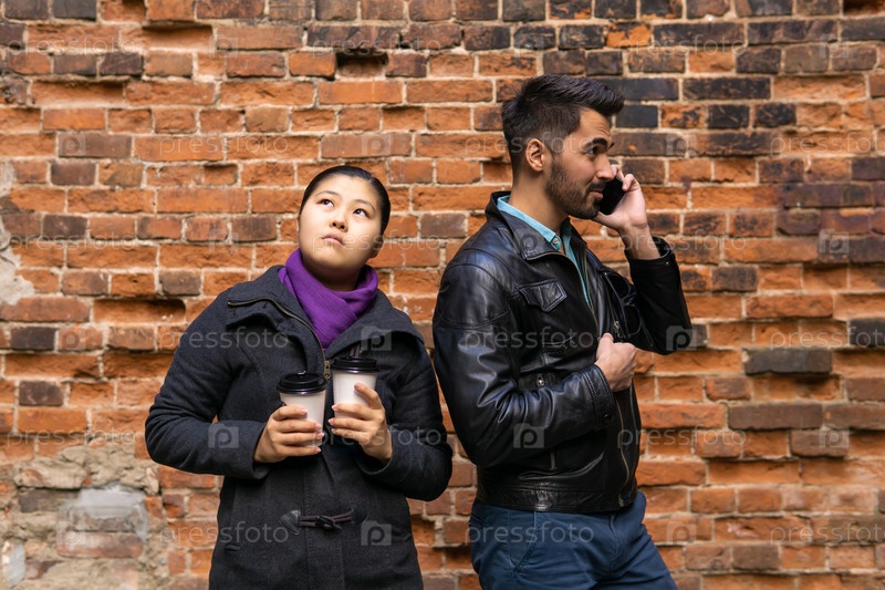 Молодой человек разговаривает по телефону, девушка скучает по двум бумажным стаканчикам кофе