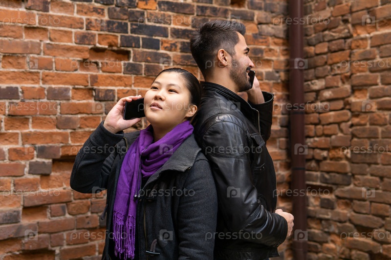 Молодой мужчина и женщина стоят рядом спиной к спине и разговаривают по мобильным телефонам