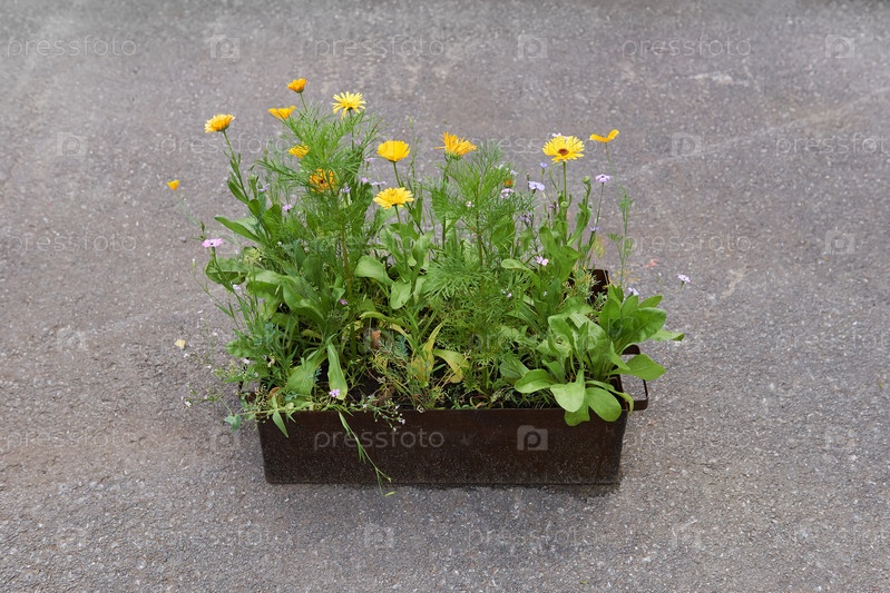 Небольшой железный ящик с полевыми цветами стоит на бетоне