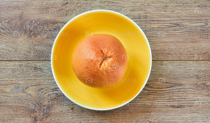 Бледно-оранжевый грейпфрут на желтой тарелке на тростниковой скатерти