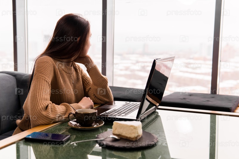 Молодая женщина с ноутбуком в кафе задумчиво смотрит в окно