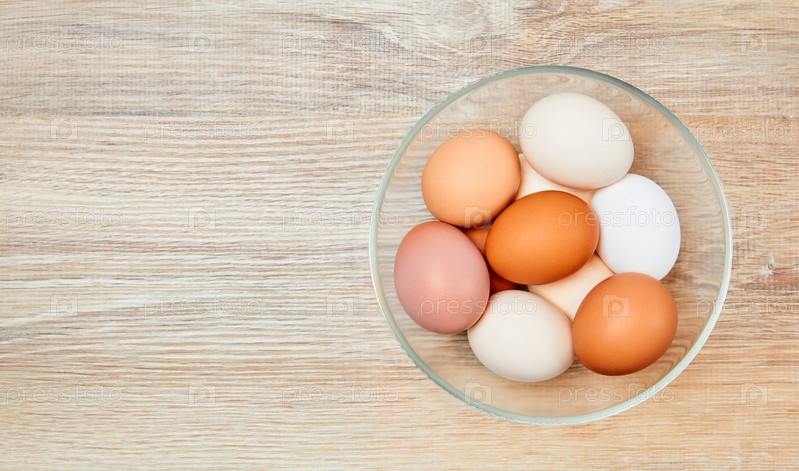 Яйца разного цвета от белого до коричневого в стеклянной миске на поверхности деревянного стола