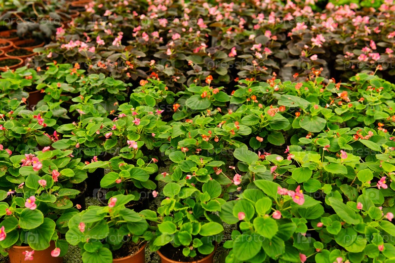 Фон - множество горшков с розовыми и красными бегониями