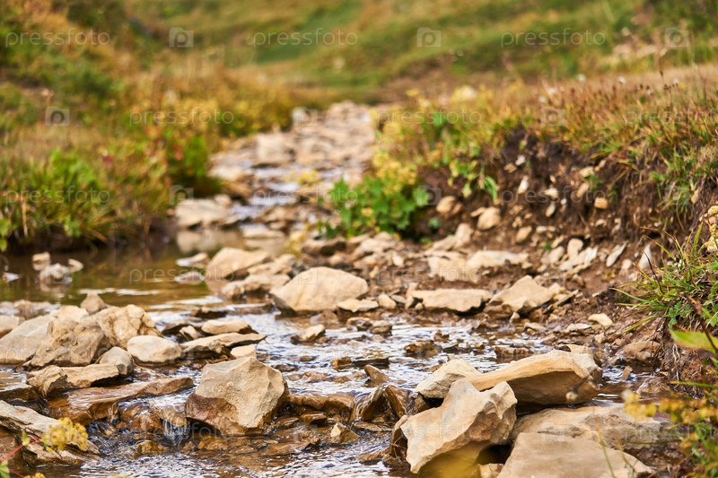Небольшой каменистый ручей среди травы крупным планом