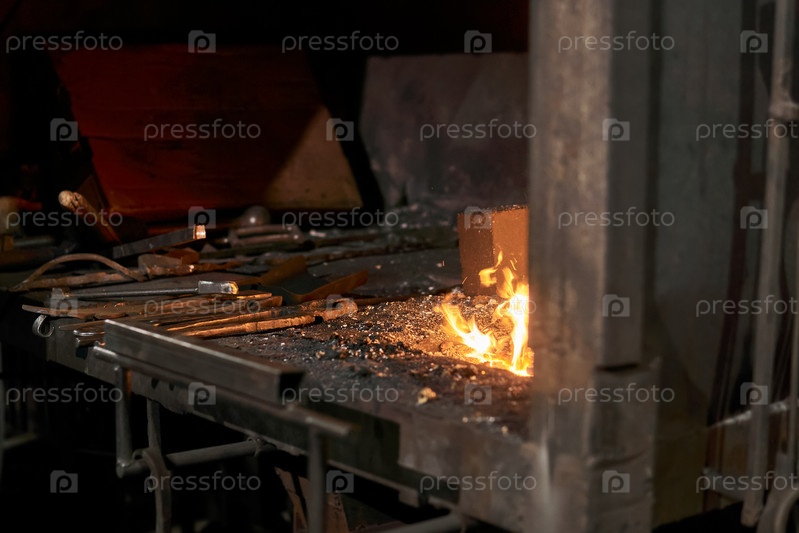 Кузнечная печь с горящим пламенем и кузнечными инструментами