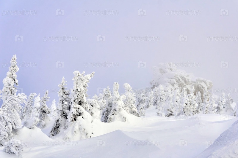 Яркий зимний пейзаж с заснеженными хвойными деревьями и скалой вдалеке