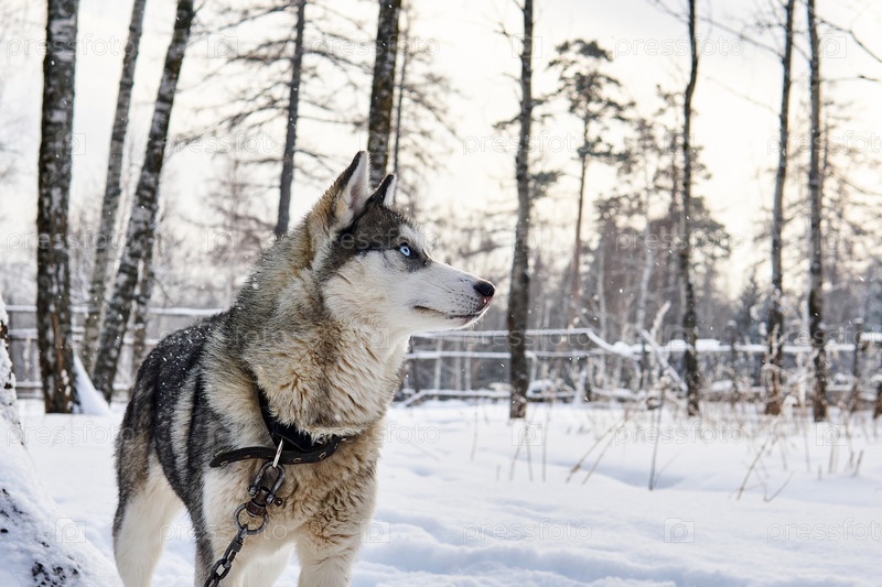 Хаски на поводке мечтательно смотрит вдаль зимой
