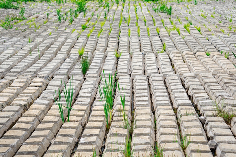 Местность, покрытая гибким бетонным матом для предотвращения эрозии, уложенным на землю, сквозь который растут растения