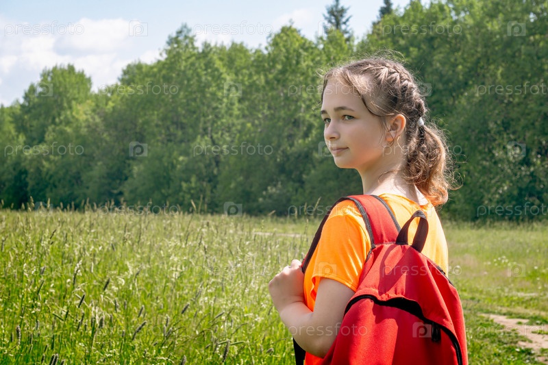 Девушка-подросток в яркой футболке с рюкзаком гуляет на природе