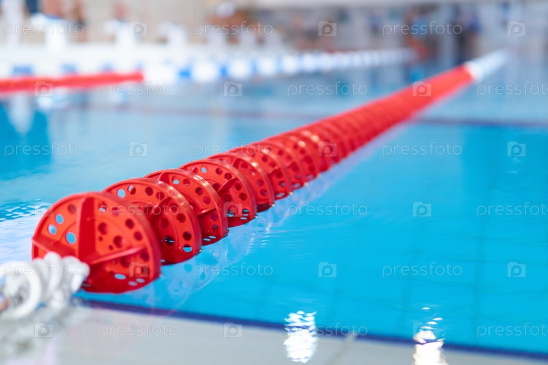 Фрагмент соревновательного бассейна с голубой водой и размеченными дорожками для плавания