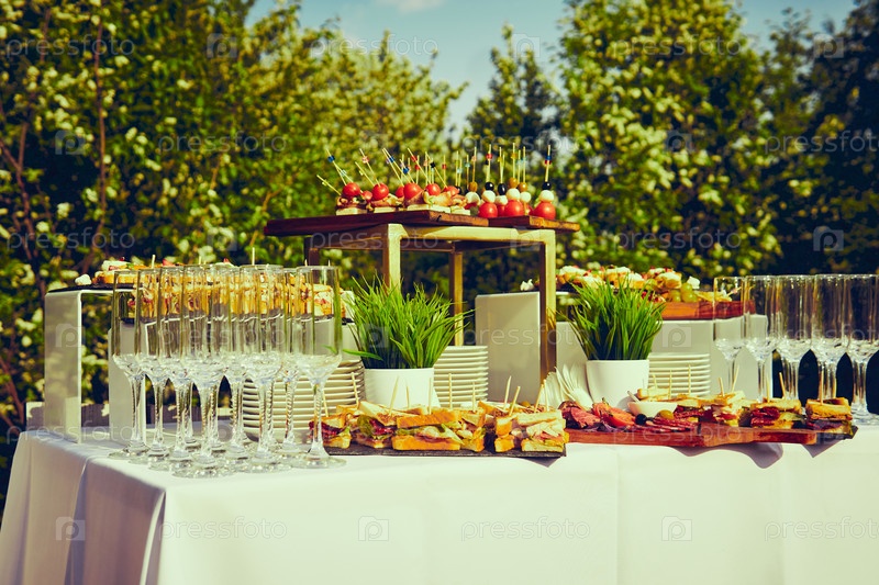 Фуршет на открытом воздухе – канапе и бокалы на фоне цветущих деревьев и неба