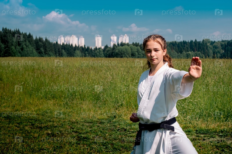 Девушка-подросток тренируется каратэ ката на открытом воздухе, выполняя удар Ои Дзуки