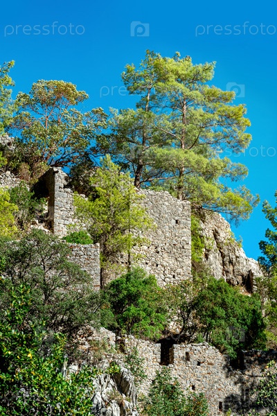 Руины крепостных стен на лесистых склонах гор в античном городе Олимпос, Турция