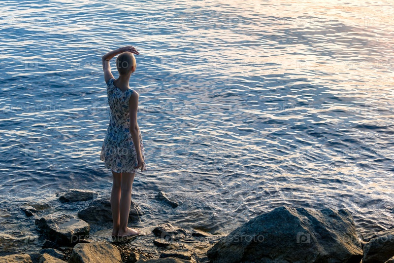 Девушка-подросток в платье стоит на берегу моря и смотрит вдаль