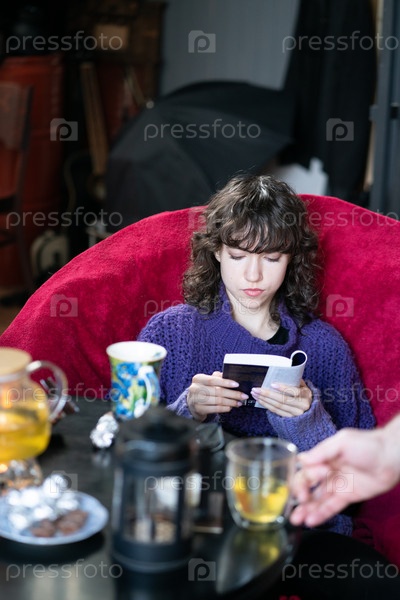 Молодая красивая женщина сидит в кресле в свитере