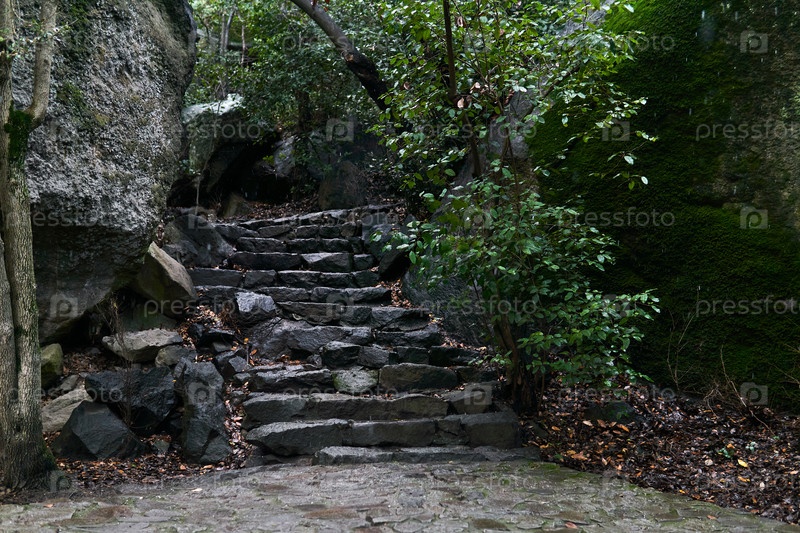Лестница из натурального камня между скалами в старом ландшафтном парке