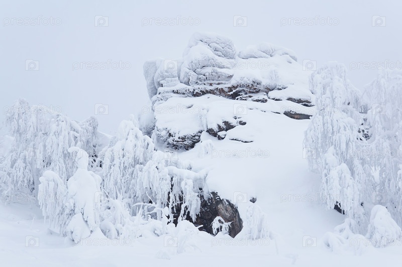 Заснеженные скалы и морозные деревья на горном перевале зимой