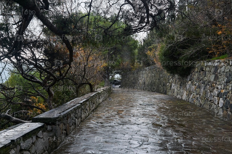 Дорога, вымощенная натуральным камнем среди скал в древнем приморском ландшафтном саду