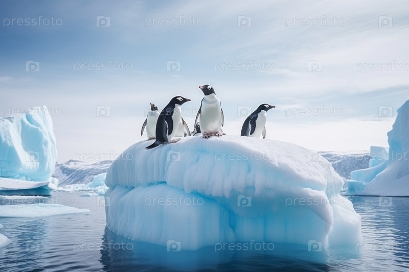 Группа пингвинов Gentoo находится на льду на фоне айсбергов