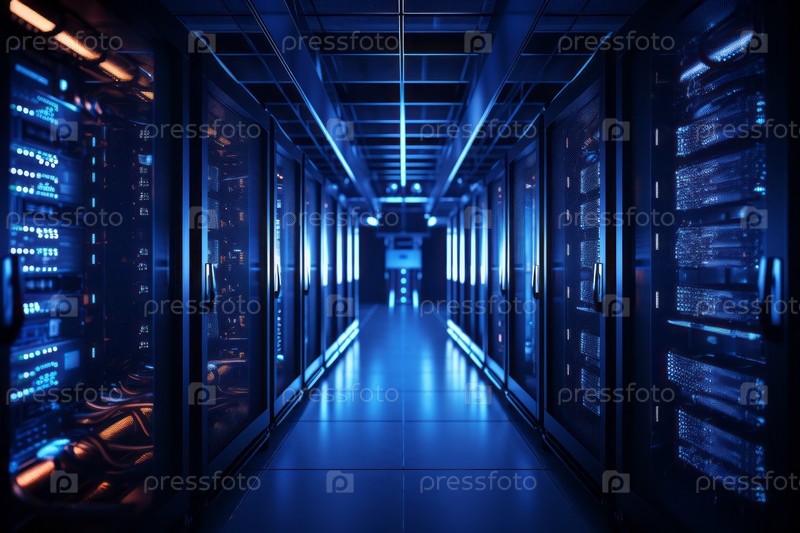 Серверные стойки в центре обработки данных серверной комнаты безопасности компьютерной сети