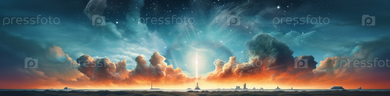 Новый космический корабль-шаттл с взрывом и клубами дыма успешно взлетает в звездное небо. Космическая миссия и старт ракеты
