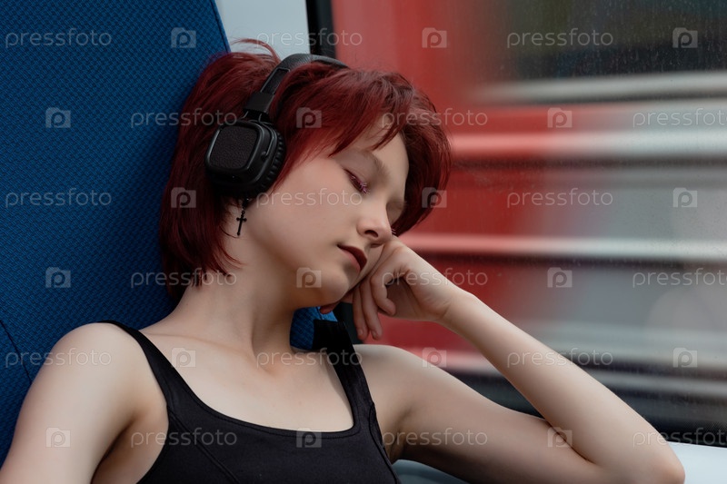 Молодая женщина задремала, сидя в кресле в вагоне пригородного поезда