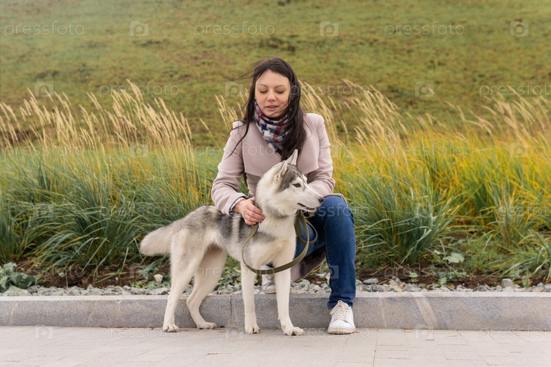 Молодая женщина со своей собакой на фоне осеннего пейзажа