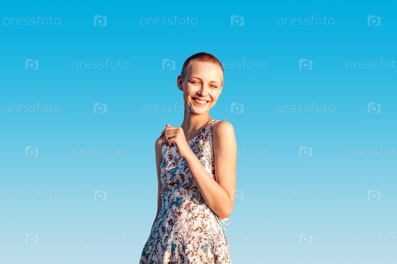 Портрет смеющейся девочки-подростка с короткими волосами в платье на фоне неба