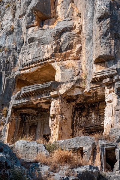Руины скального некрополя с высеченными в камне гробницами в Мирах Ликийских